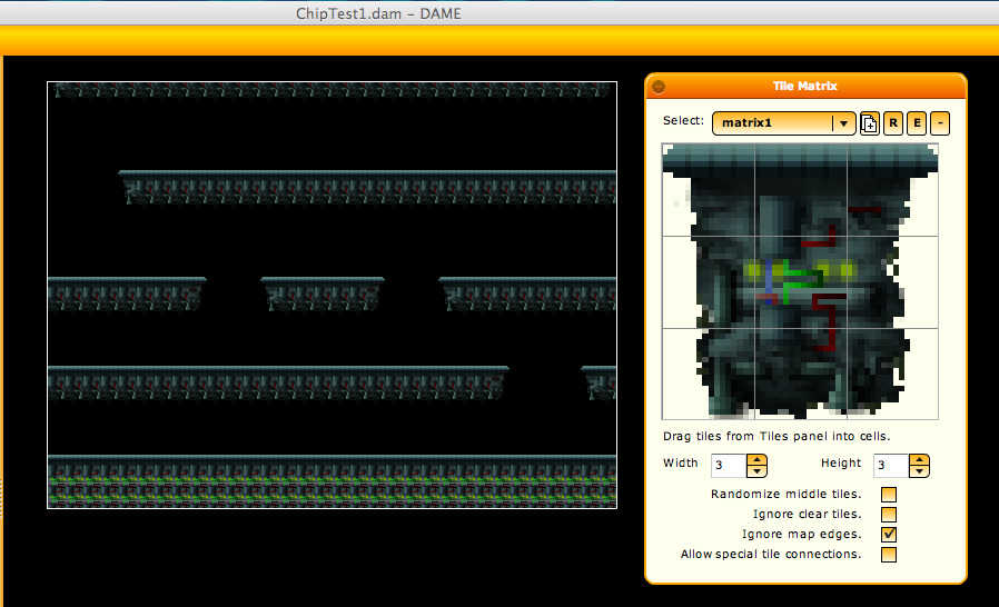 A brief note on DAME. If you’re editing levels using a simple tilesheet I highly recommend it. It’s free and while at first I couldn’t stand it, I’ve grown to love it. It’s like editing film on a Steinbeck: the fact that it’s not quite so flexible makes you think harder about what you want to do.