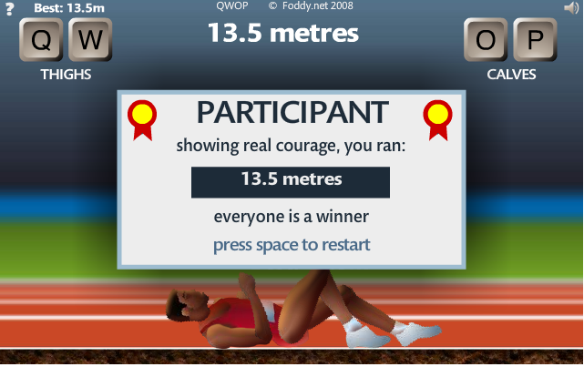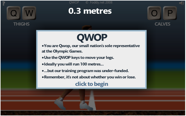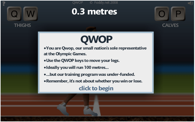 What is QWOP? Well it’s an innovative game by Bennet Foddy where you control a runner’s individual calves and thighs to try and make him run as far as possible without falling. You can play it free in-browser here to get a sense of it and it’s extreme difficulty.