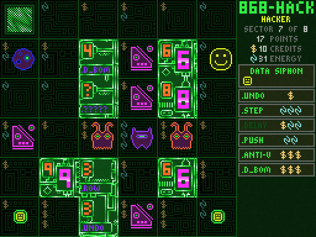 The Score program, while potentially a curse on the high-score chasers out there, is particularly inspirational to me in its design. It provides a point for every level, or “sector,” the player has left in exchange for five energy. This means it is most cost-efficient in the first sector, where it will provide the player with 7 points for every use. However, to acquire the Score program the player must unlock, or “siphon,” a tile that will spawn a whopping 6 enemies, which the player will have a more difficult time dealing with the earlier in the game they are. Furthermore, a player lucky or skilled enough to acquire the program early on is also unlikely to have enough spare energy to use it more than once or twice at first. Just the presence of the “Score” program in the game’s design raises a series of very simply put, yet complex-to-answer questions for the player in every run. Score is at its most efficient at the same time that it’s at its riskiest and least convenient, and I love that about it.